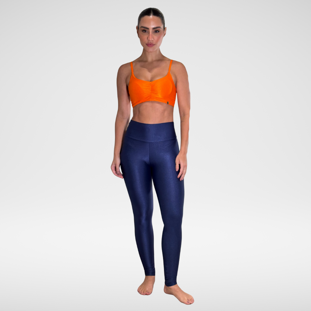 Conjunto fitness composto por top laranja e legging azul. O top garante suporte e conforto, enquanto a legging oferece liberdade de movimento e ajuste perfeito. Ideal para atividades físicas ou para compor looks modernos e descolados no dia a dia.