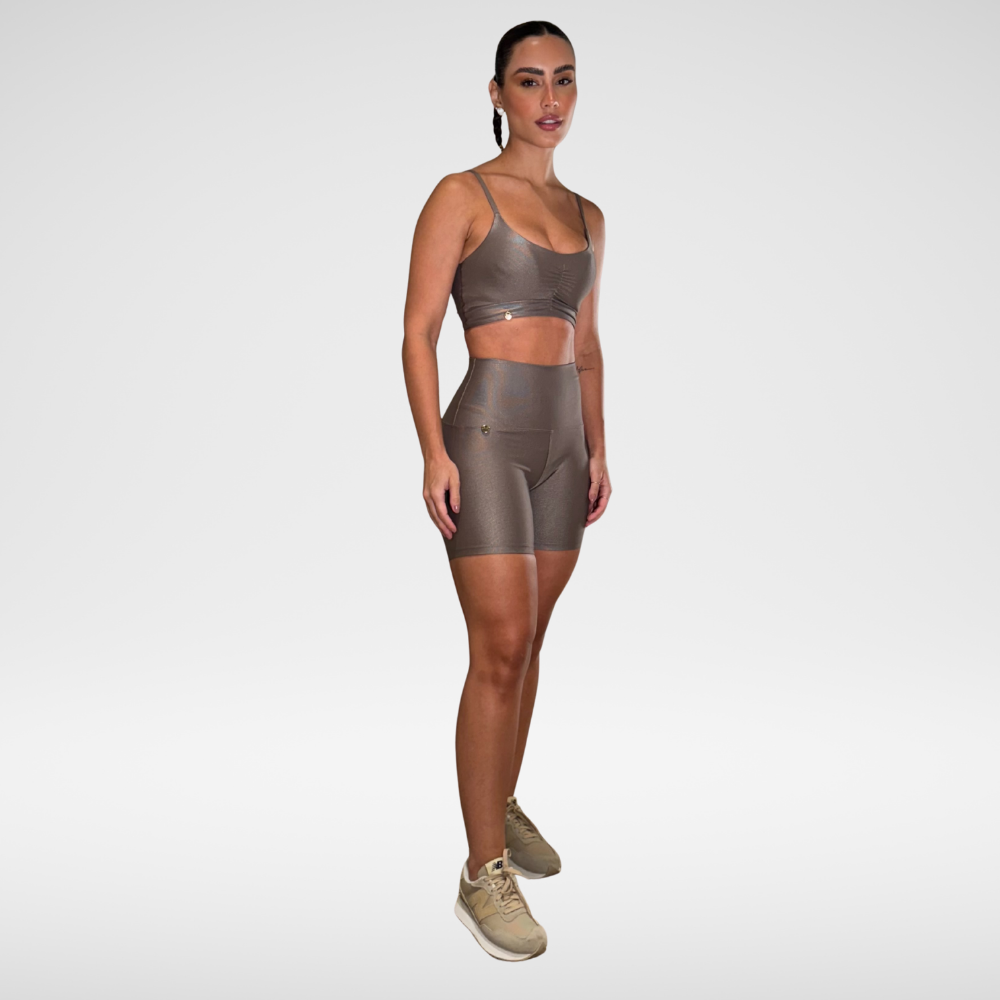 O conjunto fitness cinza une estilo, leveza e conforto para acompanhar todos os seus treinos e momentos casuais. Composto por top de alta sustentação e short modelador, ele foi desenvolvido em tecido tecnológico de secagem rápida e toque macio, garantindo total liberdade de movimento e bem-estar.